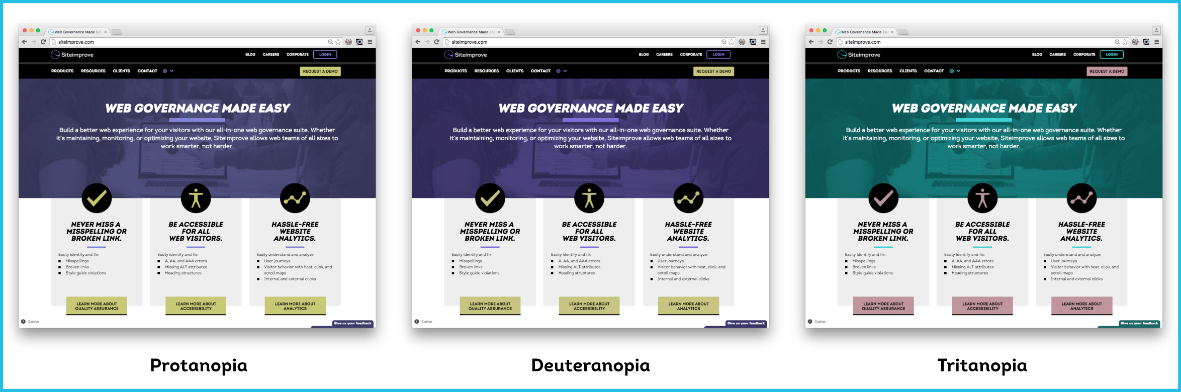 - Tritanopia: This is a reduced sensitivity to blue light, but not very common. If you use green or blue on your website, someone with tritanopia will have a hard time distinguishing between the two. If you use yellow, they may not see it or see a light shade of red instead.