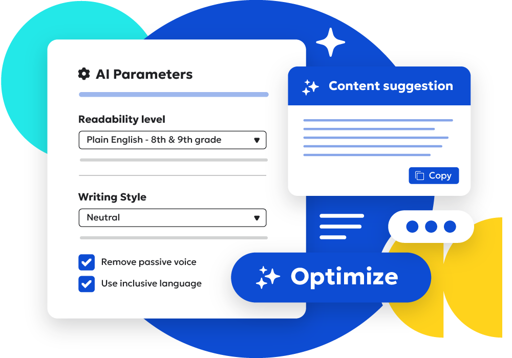 Get a mechanism to standardize content experience guidelines across teams. AI Generate™ helps you build a consistent brand voice and quickly apply it across your entire content experience. Set your own content guidelines, adjust your custom parameters, and let AI do the rest.
