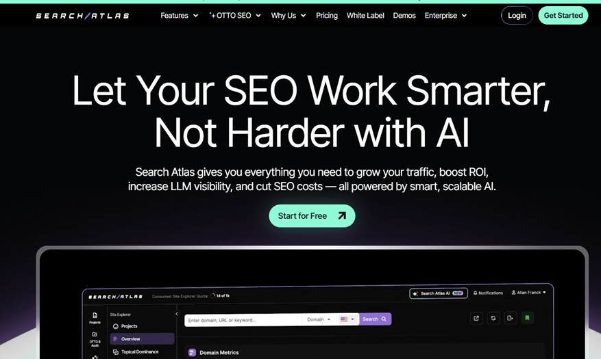 Search Atlas brings something different to enterprise SEO: pure AI horsepower. Its OTTO SEO agent doesn't just analyze pages, it executes optimizations directly on websites. That means automated title tags, meta descriptions, and image alt text without the usual back-and-forth between tools.
