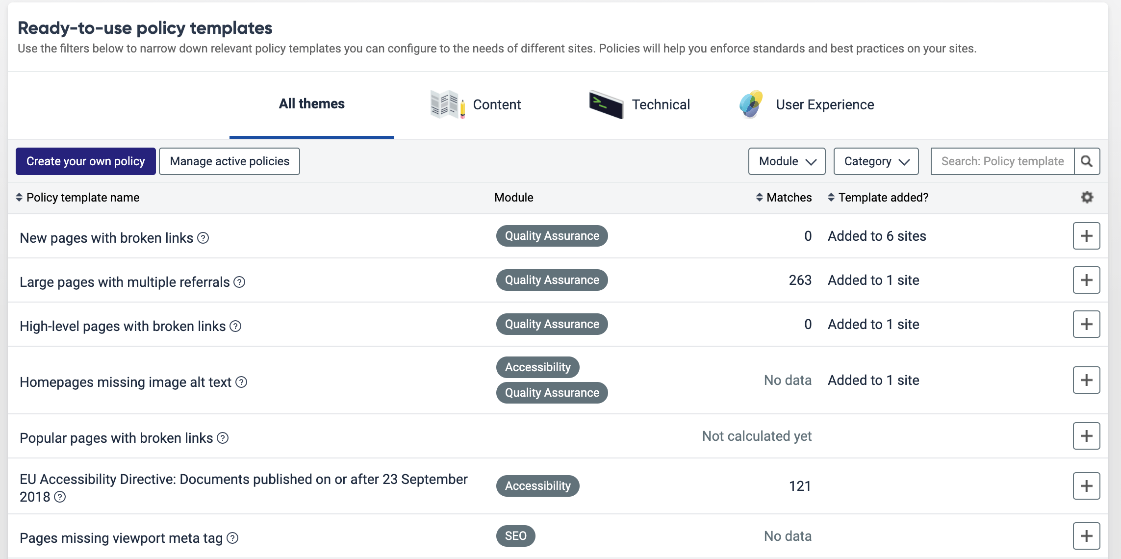 You can also use the Policy module more strategically. Use policies to source, plan, and structure your content for various content formats and assets. Our tutorials will help you get started with Siteimprove Policy.
