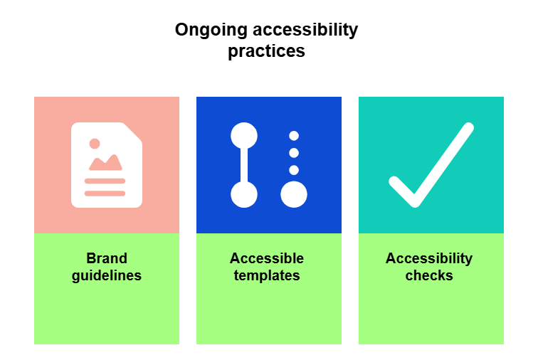 Long-term accessibility compliance depends on awareness and accountability from everyone on your team. Marketing teams need to know how to write accessible content and emails. Designers need to know how to create accessible layouts and color schemes. And developers need to know how to code accessible interfaces.