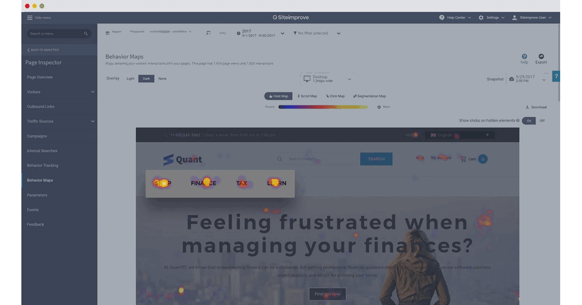 This example from Siteimprove’s Heat Map feature shows where page visitors spend their time. On this page, it might be useful to put the main CTA higher on the page and remove some of the menu options that seem to distract visitors from the main CTA.