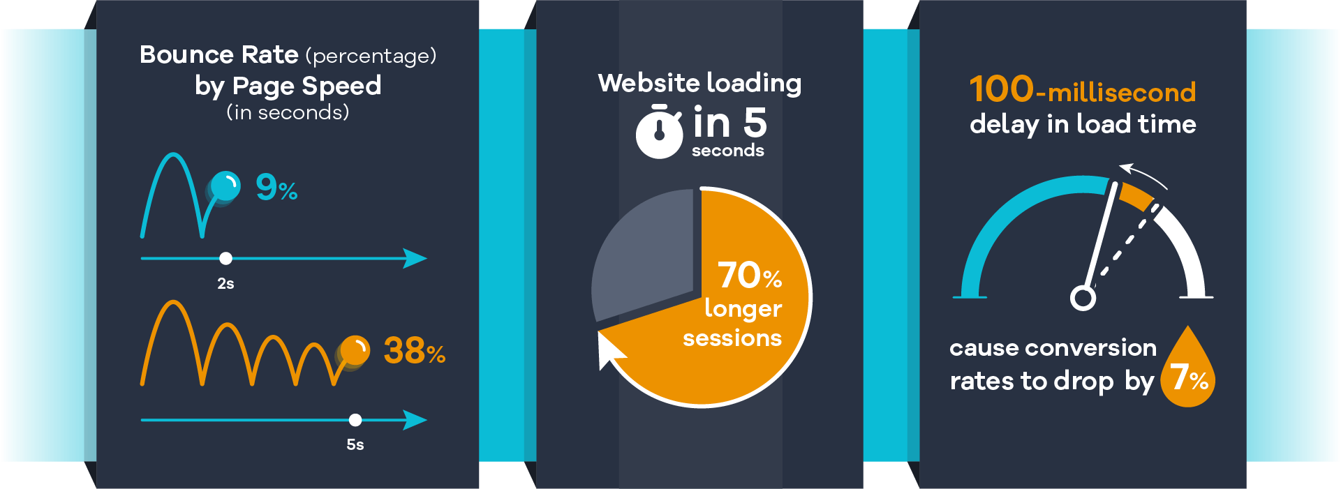 For instance, pages that load within two seconds have an average bounce rate of 9% while pages that take five seconds to load have a bounce rate of 38%. Websites that load in five seconds average 70% longer sessions—translating to more conversions. In fact, a mere 100-millisecond delay in load time can cause conversion rates to drop by 7%.