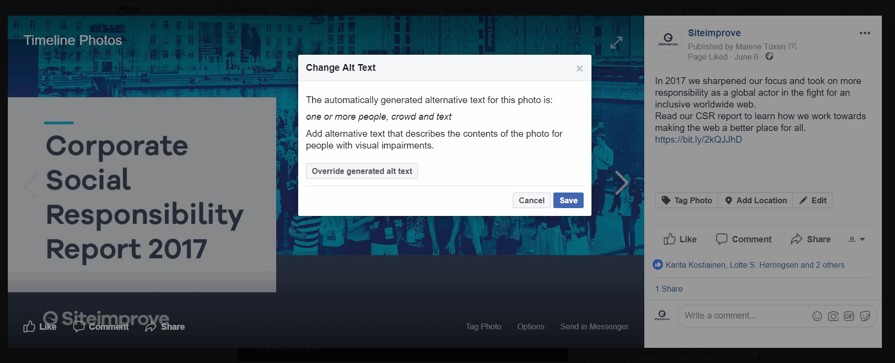 It’s also useful to know that even if you don’t provide alt text on an image, Facebook can do it for you. In 2016 the company introduced an auto alt text algorithm that recognizes common objects and concepts in photos and generates tags that make the images more accessible for low-vision users. Of course, these auto descriptions can be too vague, so if you want to make sure your content is identified properly, adding descriptions by hand is still the recommended method.
