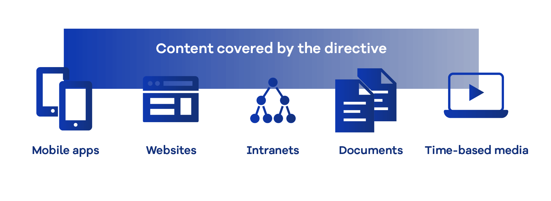 The public sector is described as any state, regional, or local authorities which are governed by public law. If you fall within this category, the directive applies to you. This includes administrations, courts, police departments, public hospitals, universities, schools, and libraries.