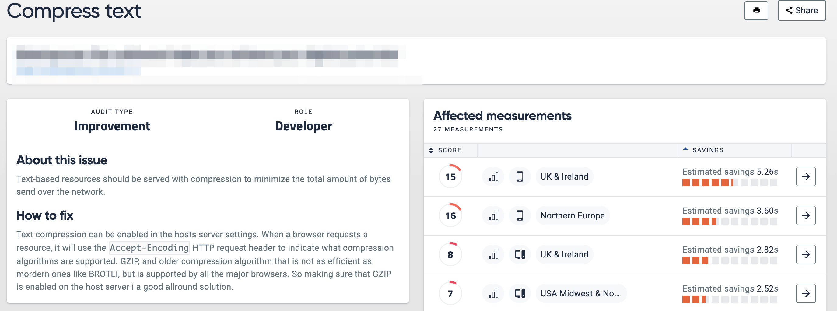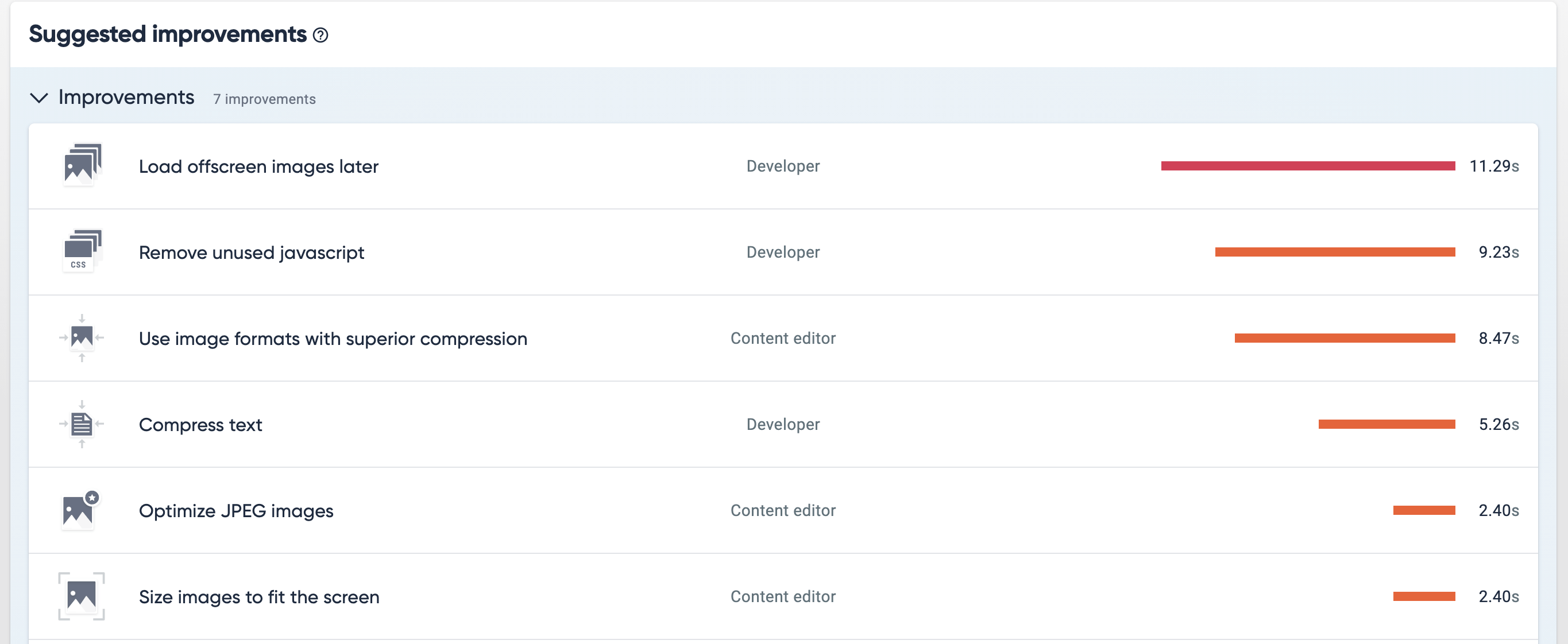 Click into each suggested improvement for technical instructions on how each issue should be tackled, by whom, and how many seconds of performance you stand to gain by resolving it.
