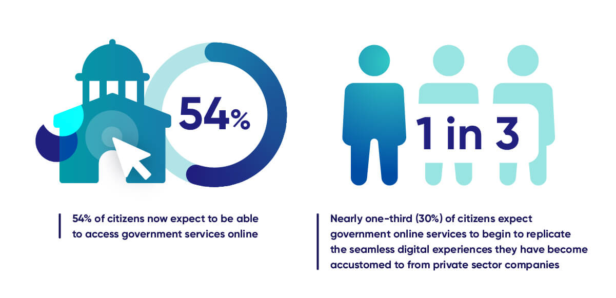 Research shows that 54% of citizens now expect to be able to access government services online. Moreover, nearly one-third (30%) of citizens expect government online services to replicate the seamless digital experiences they have become accustomed to from private sector companies.