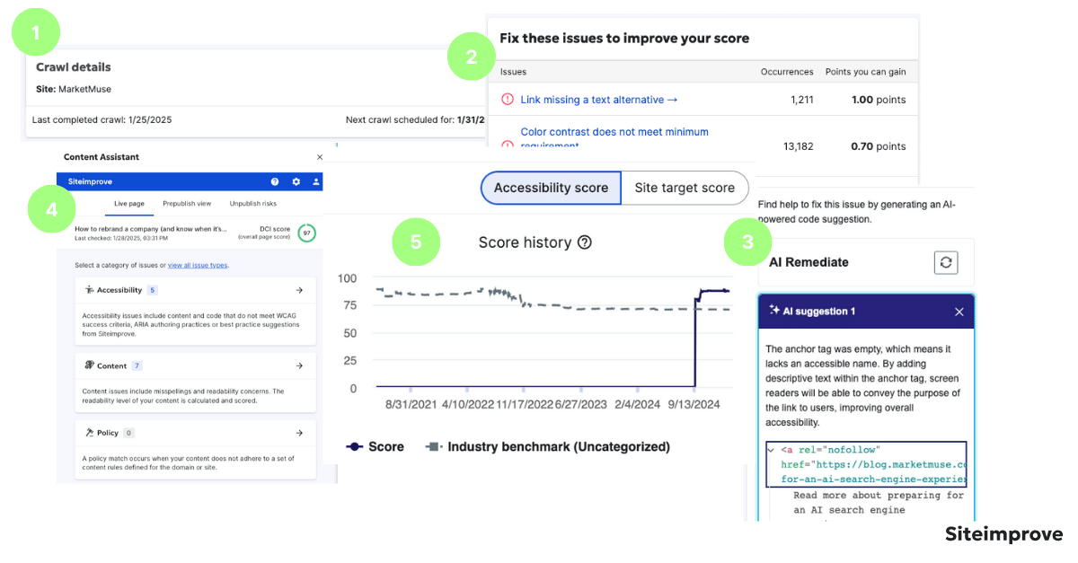 Identifying Technical SEO Issues: Siteimprove's crawlers find technical problems that make it hard to read, like broken links, missing alt text, and wrong use of headings. These issues often overlap with technical SEO problems, and fixing them improves both accessibility and search engine crawlability.