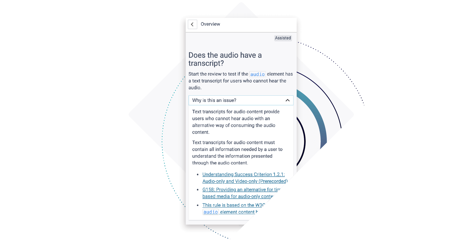 In the potential issues section, you can quickly review potential accessibility issues using an assisted review flow. The review flow will guide you step-by-step and ask clear, simple questions to guide you to the most accurate results.