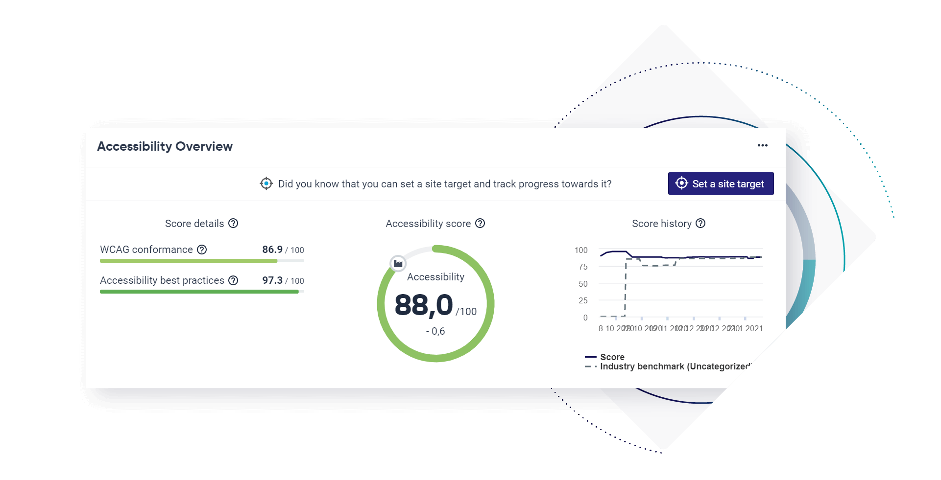 Your site target is the perfect pairing to your Accessibility Digital Certainty Index® (DCI®) score, which measures your site’s accessibility compared to other companies in your industry. Your Accessibility DCI® score gives you a broader overview, while the site target lets you hone in on a clear, shared goal.