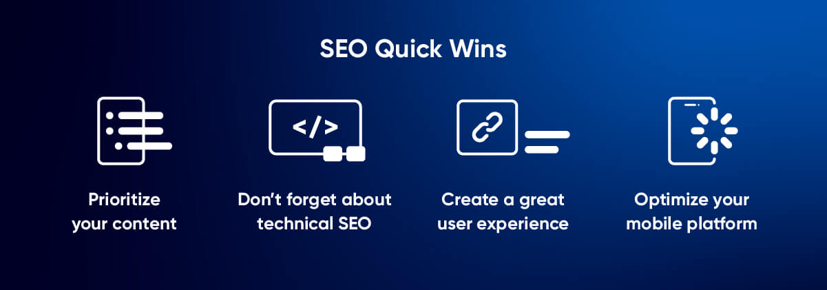 - Prioritize your content: This quick win will have a huge impact on your SEO search results. If you want to make the most of your SEO, ensure your content utilizes meta titles and descriptions, is recent, optimized for keywords, and free of errors.