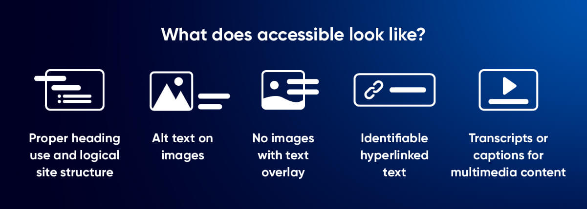 - Proper heading use and logical site structure: Because assistive technologies rely on heading tags to scan your website, your content should be set-up in a way that makes it readable for everyone.