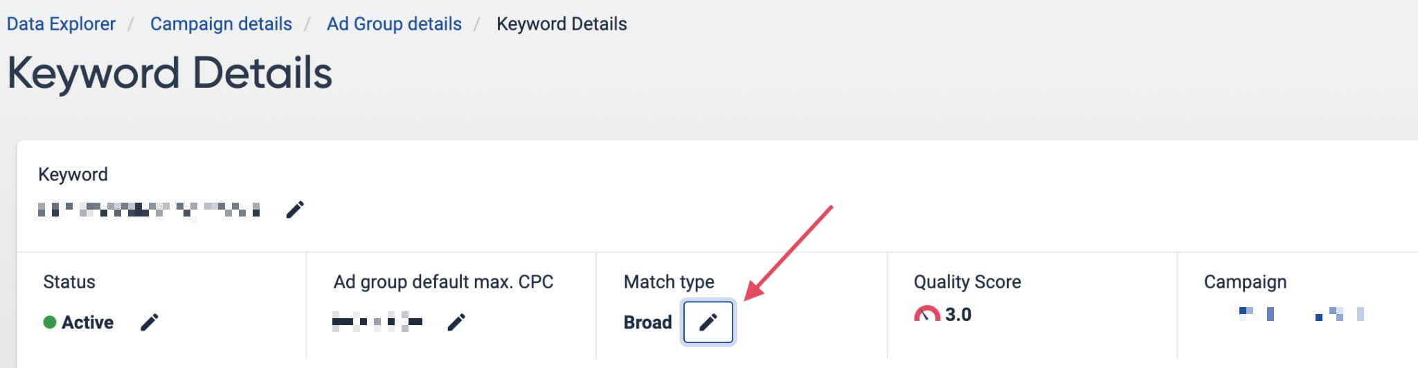 If you find that you do have a campaign running with Google’s default broad match that’s negatively affecting your campaign performance, you can quickly change the match type from within Siteimprove Ads for a specific keyword.