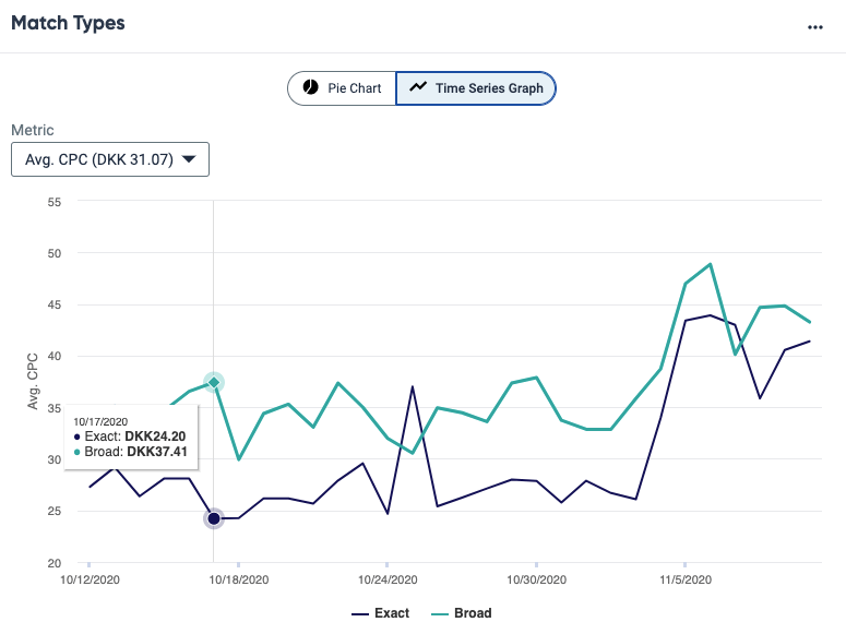 From Siteimprove Ads, you can look at how different keyword match types have impacted various metrics. For example, you can see if you have any broad match keywords driving up the cost of your cost per clicks and how many conversions each match type has over time.