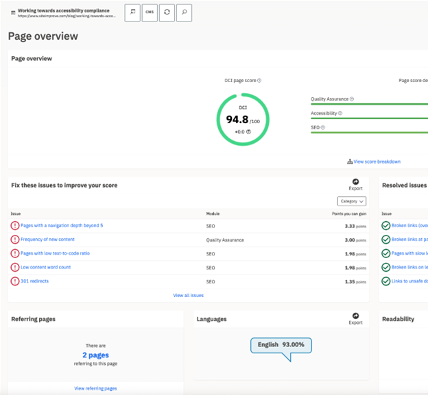 Siteimprove takes the guesswork out of the equation. Its quality assurance and scoring frameworks benchmark every draft for SEO readiness, accessibility, link hygiene, and brand voice—so you can quantify quality instead of hoping it “feels right.” With dashboards that highlight readability, meta data gaps, and contrast errors, a content team doesn’t need to debate whether something is publishable. They can measure it.