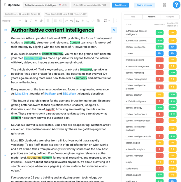 Where Siteimprove ensures you’re meeting non-negotiable standards, MarketMuse pushes content further—surfacing gaps in topical depth, identifying missed subtopics, and showing where a draft lacks authority compared to competitors. Instead of publishing thin articles that risk Google’s indifference, a content team can build content clusters that deliver comprehensive answers and stand up to scrutiny from both search engines and peers.