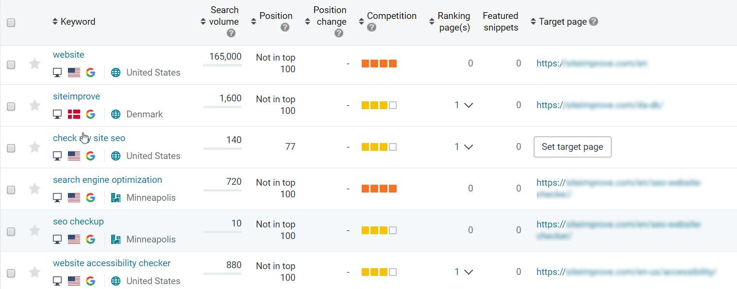 Siteimprove SEO Advanced enables you to track these metrics with ease. For example, with Keyword Monitoring, you can monitor relevant keywords and get the vital data, such as estimated traffic, rankings, featured snippets achieved, and search volume, on how well your pages are performing in search engine results.