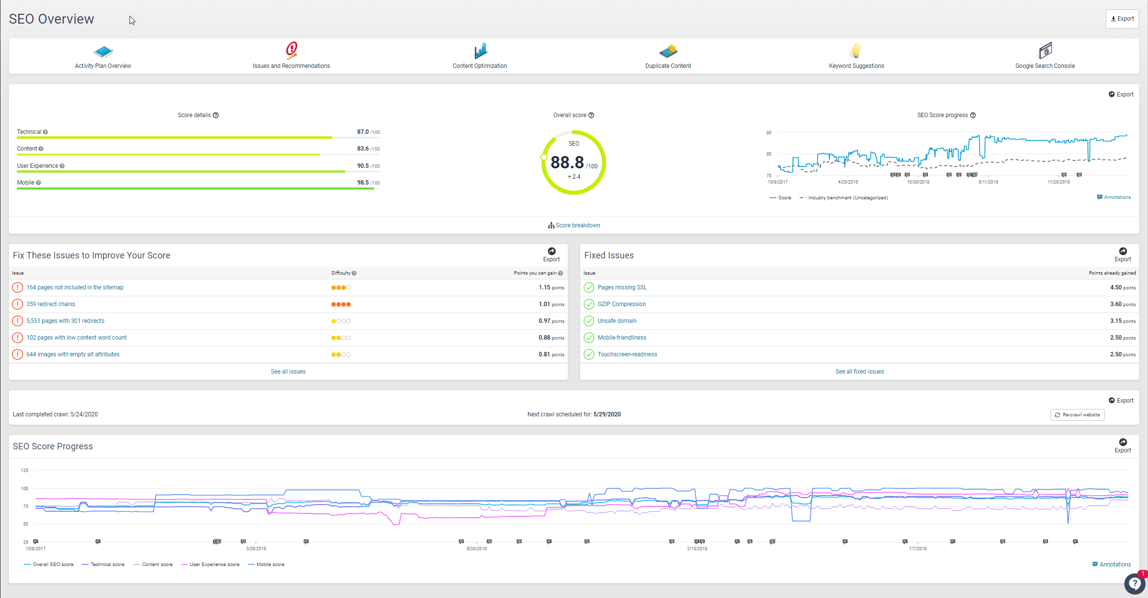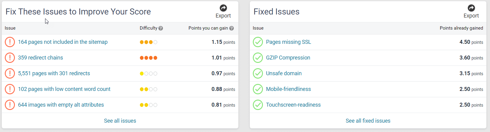 The tool also lists resolved issues, so you’re able to keep track of your overall SEO progress. With just a glance your stakeholders can see what’s been completed, and how difficult that fix was. Of course, it’s possible to export the data from the platform to share with other stakeholders, in HTML, PDF, and Excel form.