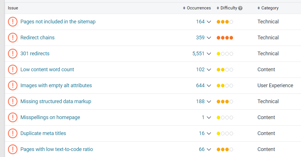 Difficulty-level rankings are also on-hand to help you assign the appropriate time and resources to each fix. For example, which issues require advanced technical knowledge – or even sign off by senior management, such as domain changes or URL structure, and which can be easily made by a web editor via a CMS, like misspellings and broken links.
