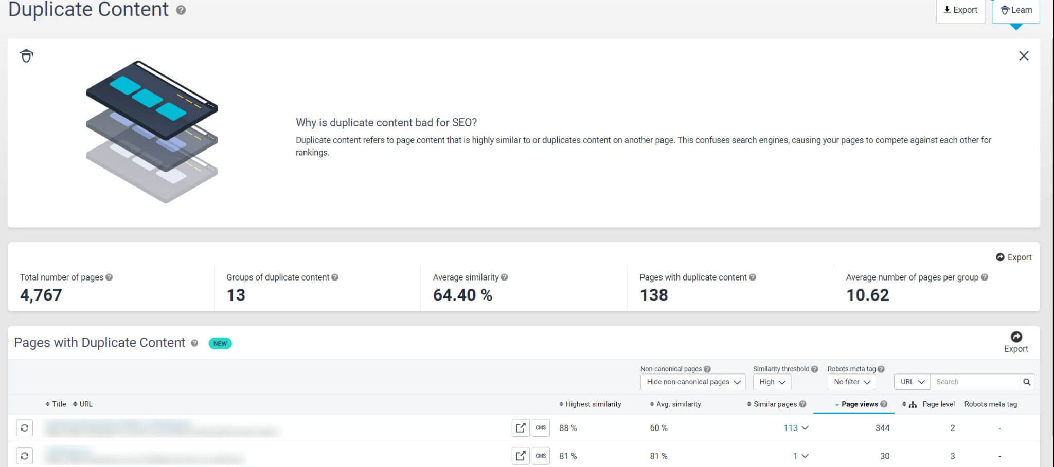 Siteimprove SEO’s Duplicate Content Finder is an example of a feature that does the SEO heavy lifting for you. It detects duplicate content in seconds using a machine-learning algorithm, along with page view statistics, so you can focus your efforts on editing or removing the most harmful duplicates first.