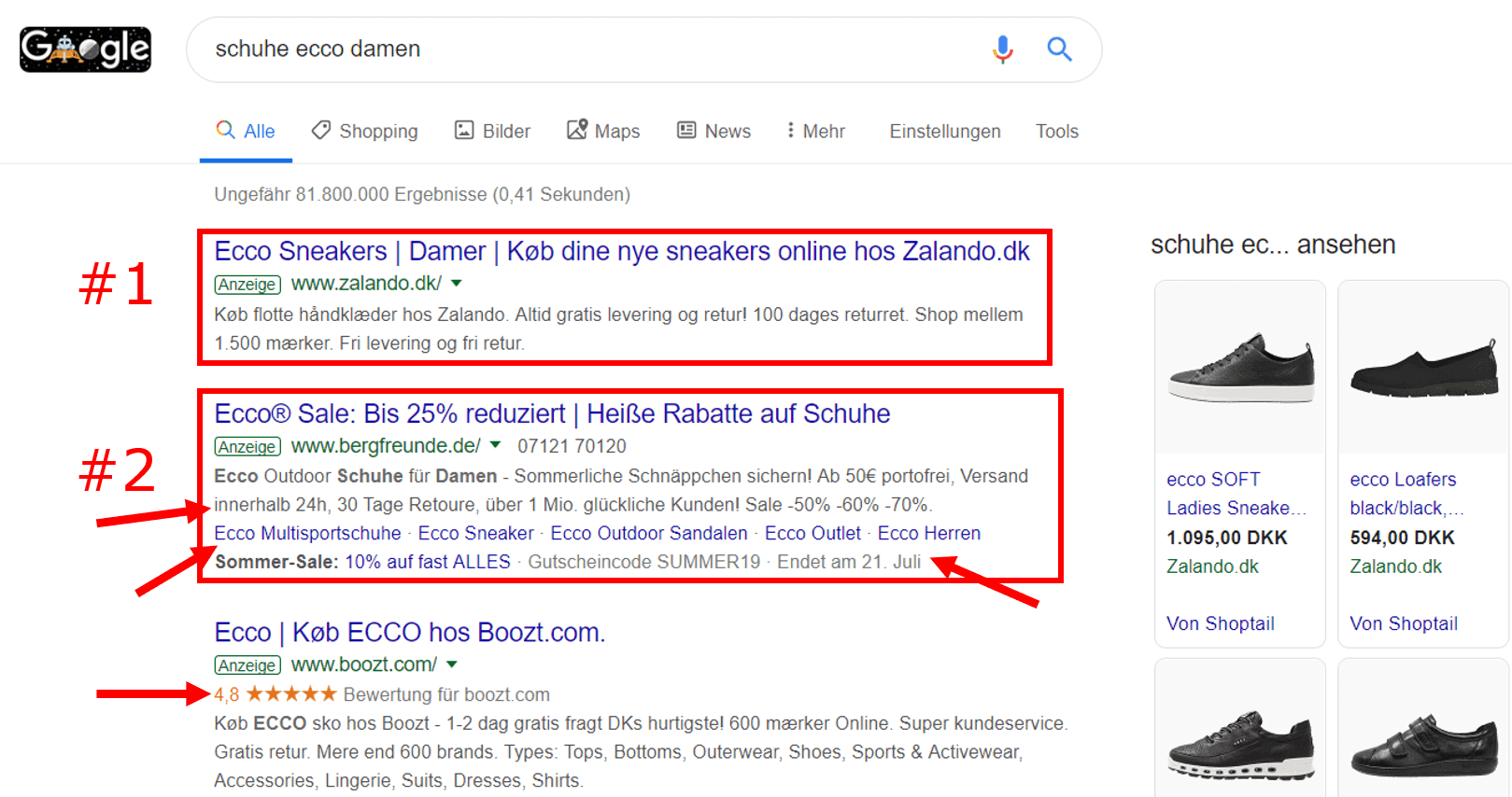 Während beispielsweise eine Anzeige (nennen wir sie Anzeige #1) in erster Position in den Suchergebnissen sein könnte, wird die Anzeige #2 mit mehr Anzeigenerweiterungen (wie Sitelinks und Anruferweiterungen), mehr Platz auf der Seite einnehmen und dadurch mehr Aufmerksamkeit erregen. Darüber hinaus können Anzeigen, die in der Seitenleiste von Google erscheinen, auch Erweiterungen mit Verkäuferbewertungen enthalten, also die Bewertungen von Nutzern anzeigen und damit vertrauenswürdiger erscheinen als solche ohne Bewertungen.