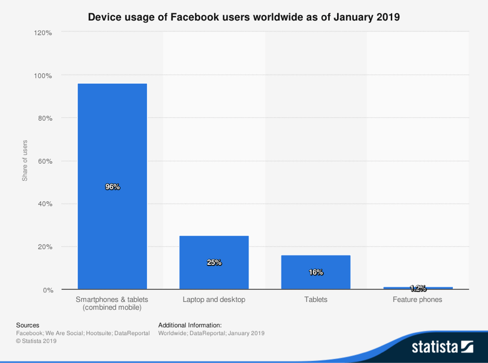 Ein einfacher, aber wirkungsvoller Tipp: Wenn Sie vertikale Videoanzeigen für Facebook erstellen, sind Sie anderen einen Schritt voraus. Die überwiegende Mehrheit der Online-Bilder und -Videos ist horizontal formatiert, aber die meisten Smartphone-Nutzer halten ihr Handy vertikal. Darüber hinaus zeigen Daten von Statista, dass 96% der Facebook-Nutzer ihre Newsfeeds mit einem Smartphone oder Tablett überprüfen. Die folgende Tabelle zeigt Ihnen die Zahlen dazu: