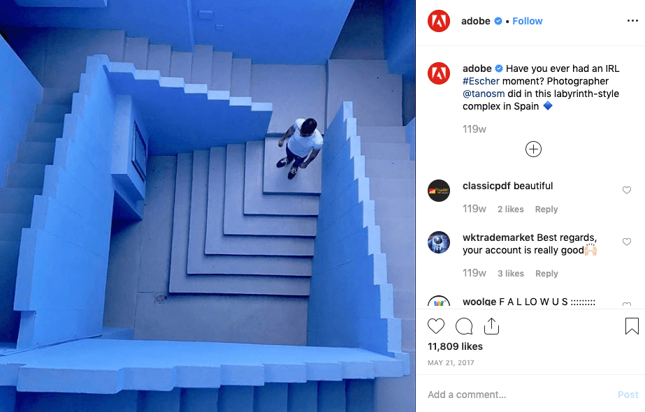 Adobe verfügt über eine sehr effektive Benutzergenerierung von Content-Kampagnen. Mit dem Hashtag #Adobe_Perspektive teilen Künstler und andere Inhaltsersteller Fotos auf Instagram, die zeigen, wie sie Adobe für ihre Arbeit einsetzen.