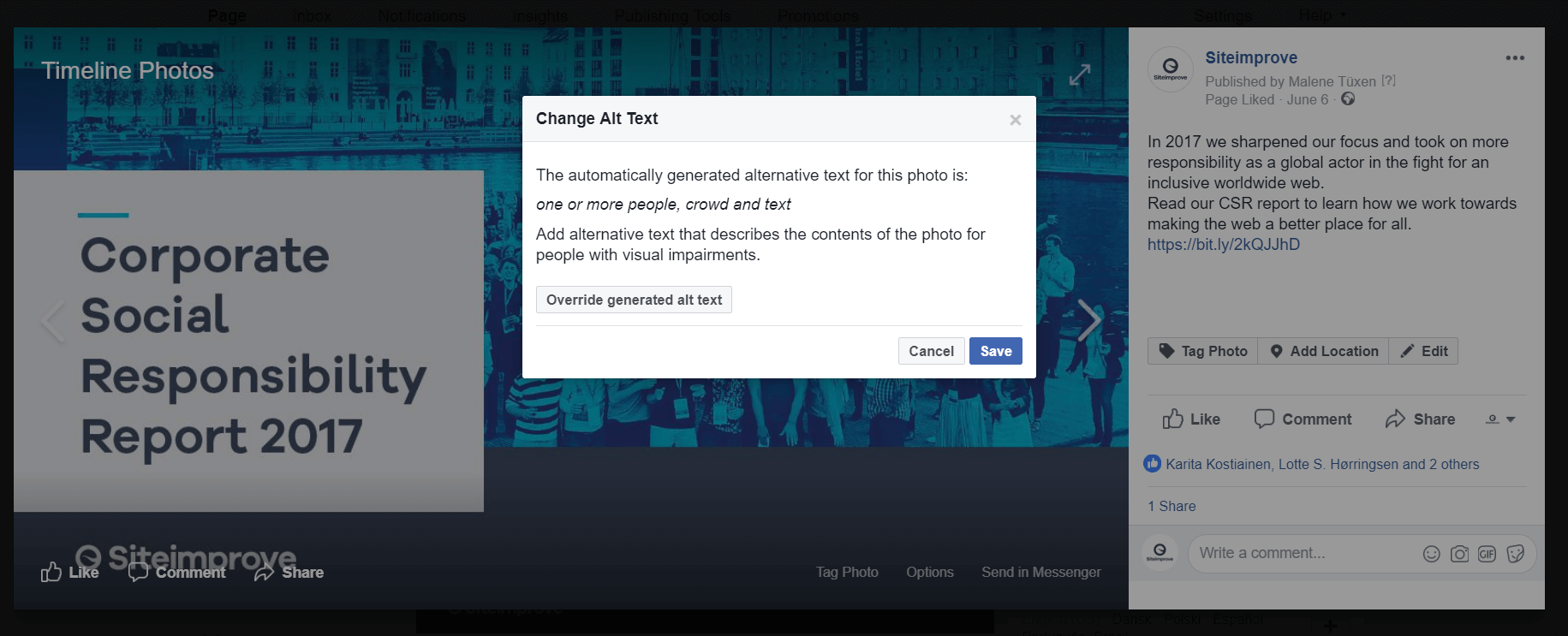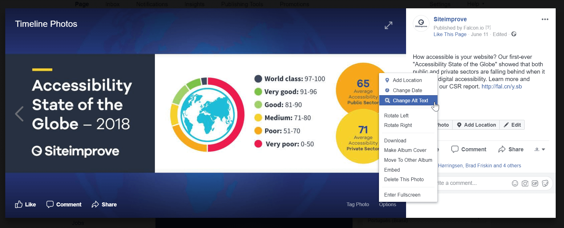 Um einem Bild auf Facebook einen ALT-Text hinzuzufügen, klicken Sie auf „Bearbeiten“ und dann auf „ALT-Text ändern“. Sie sind nicht sicher was Sie als ALT-Text hinzufügen sollen? Facebook erstellt automatisch einen ALT-Text für Bilder, so wie auf dem Bild unterhalb dargestellt. Sehr praktisch!