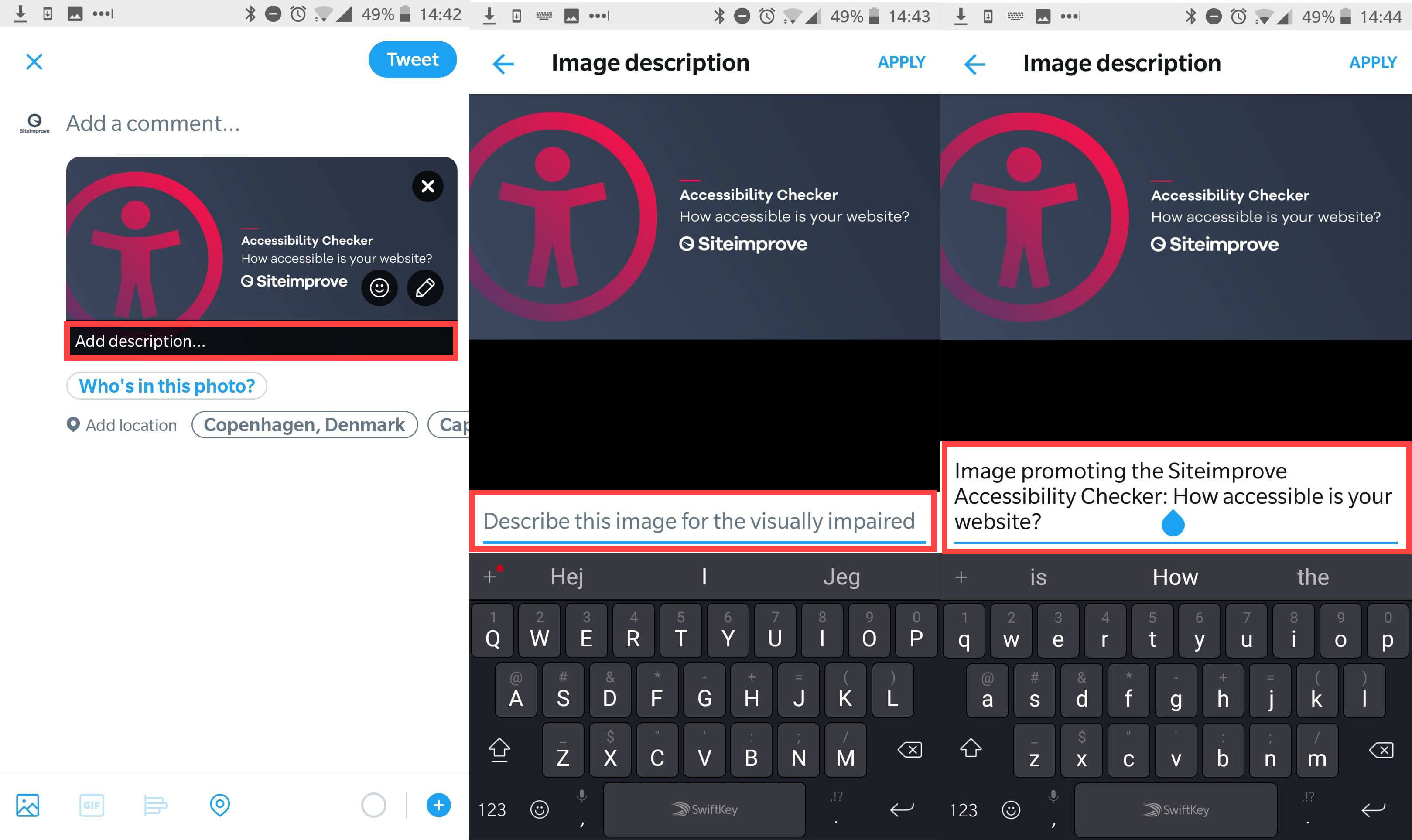 Das Twitter Hilfe-Center bietet Schritt-für-Schritt Anleitungen, um Beschreibungen für jedes gepostete Bild hinzuzufügen. Das ist besonders für User mit eingeschränkter Sehkraft von Vorteil und für alle jene, die assistive Technologien verwenden. In 2016 hatte Twitter ursprünglich Beschreibungen als ausschließlich mobile Option ausgerollt, heute werden Plattform-spezifische Lösungen für Android und iPhone Apps und twitter.com angeboten. Darüber hinaus, bietet das Hilfe-Center Anleitungen an, um Twitter mit unterstützenden Technologien wie VoiceOver für Mac, JAWS für Windows und NVDA für Windows, zu nutzen.