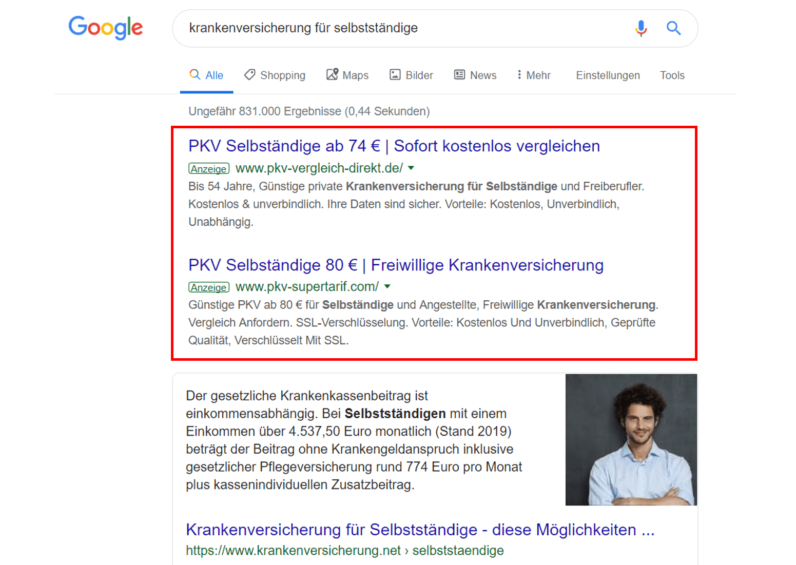 In den beiden ersten Anzeigen können Sie genau sehen, wie alles auf Keywords optimiert wurde: Die Überschrift verwendet das verwandte Keyword "PKV für Selbstständige", und der Text beinhaltet die in der Suche verwendeten Keywords "Krankenversicherung" und "Selbstständige". Darüber hinaus enthält die Anzeige verwandte Wörter wie "Freiberufler", "Vergleichen" und "Unverbindlich", was für die Suche relevant sein kann.