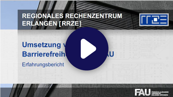 Der Vortrag von Wolfgang Wiese, Leiter Ausbildung & Information des Regionalen Rechenzentrums Erlangen der FAU, wurde im Rahmen der Veranstaltung „Digitale Barrierefreiheit für Hochschulen“ vom 07. April 2021 aufgezeichnet.