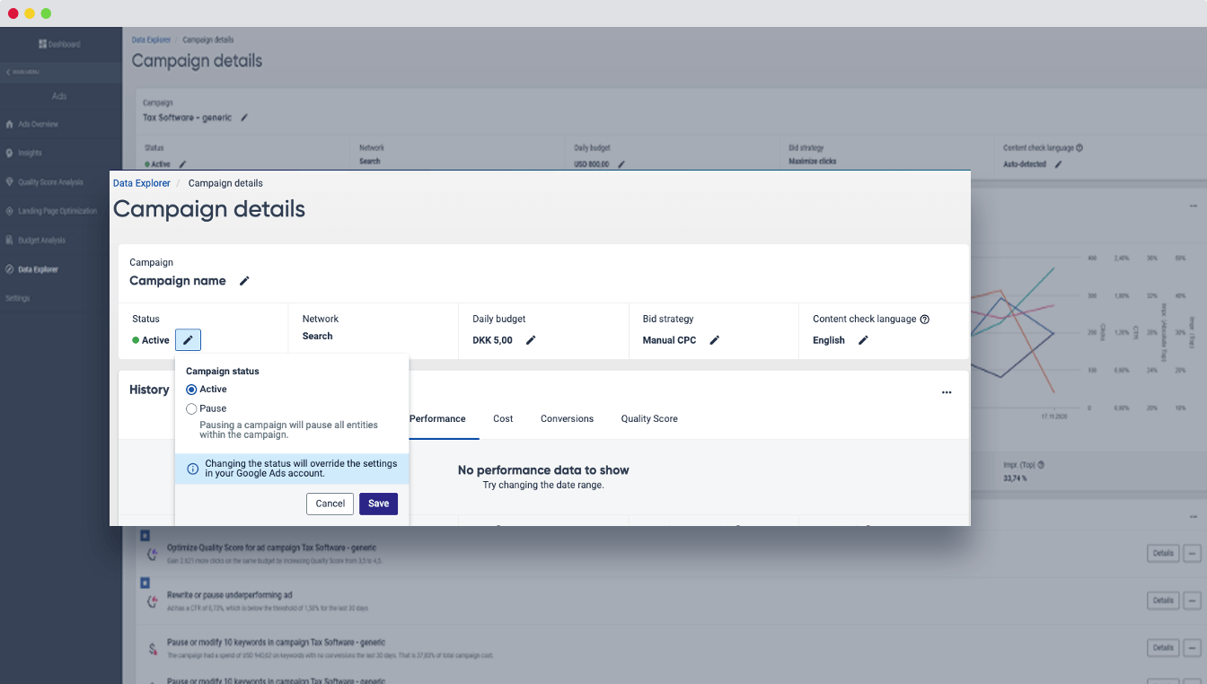 Arbeiten Sie effizienter und nehmen Sie direkt in Siteimprove Verbesserungen in Ihrem Google-Ads-Konto in Echtzeit vor. Stimmen Sie die Budgets für verschiedene Kampagnen ab, optimieren Sie Ihre Gebote auf Keyword-Ebene und vieles mehr.