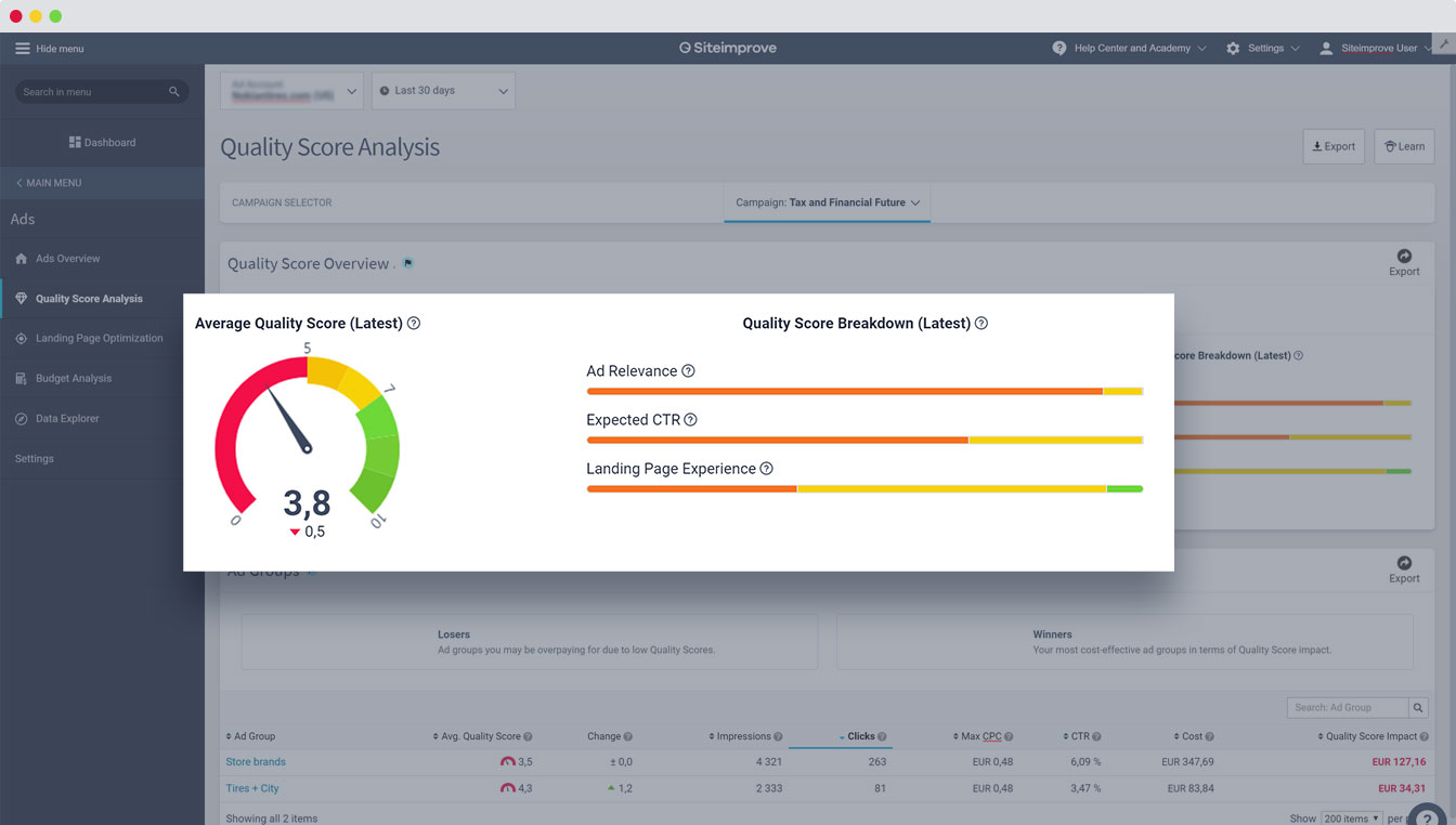 Erkennen Sie auf Anhieb, welche Ads-Kampagnen Aufmerksamkeit benötigen, und setzen Sie entsprechende Prioritäten. Siteimprove Ads macht Googles Qualitätsfaktor verständlich und hebt seine Auswirkungen auf Kampagnen-, Anzeigengruppen- und Keyword-Ebene hervor. So erkennen Sie, welche Aspekte sich auf die Anzeigenkosten auswirken, und können mehr Traffic bei geringeren Kosten erzielen.