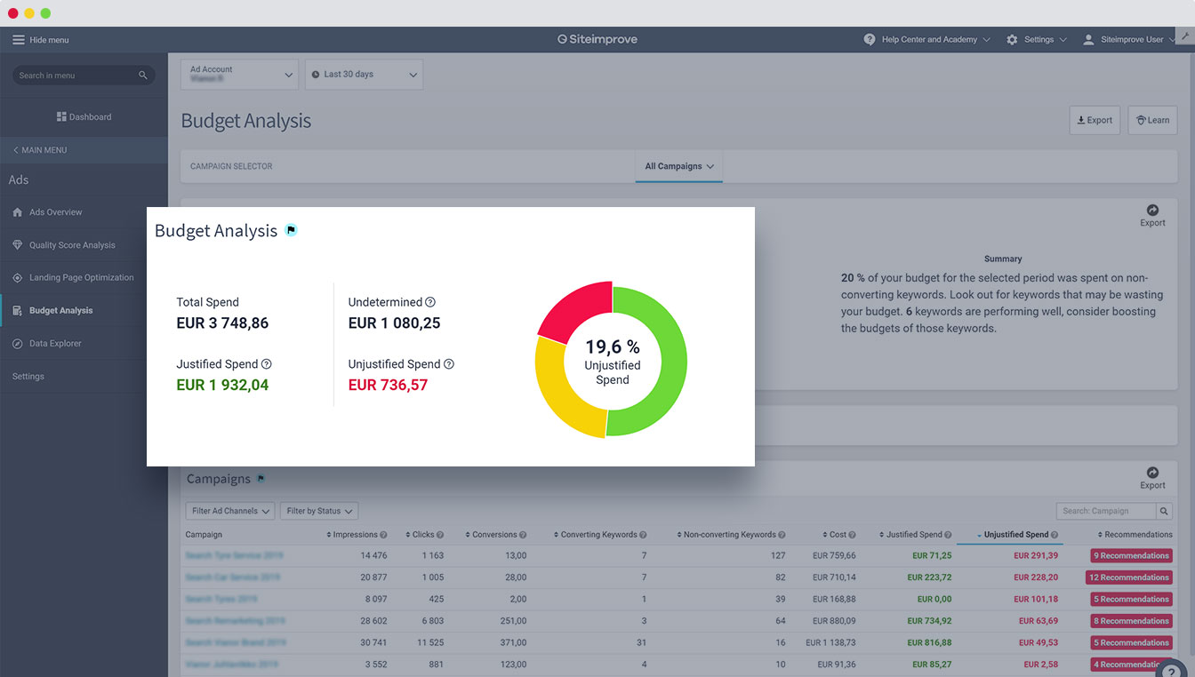 Wenn Sie mehrere Anzeigen und Kampagnen gleichzeitig einsetzen, haben Sie schnell den Überblick über Ihre Ausgaben verloren. Mit der Budget-Analyse können Sie nachvollziehen, wo Ihr Budget zum Einsatz kommt – und wie Sie es vielleicht besser nutzen könnten. Siteimprove Ads hebt ungerechtfertigte Anzeigenausgaben hervor, erkennt Keywords, die nicht zu Conversions führen, und gibt Ihnen klare Keyword-Empfehlungen. So können Sie Ihr Budget optimal einsetzen und mehr für Ihr Geld bekommen.
