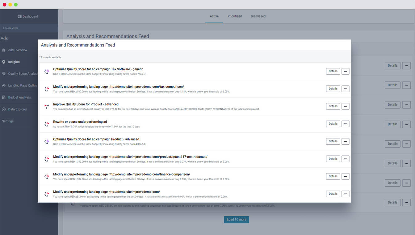 Es gibt zahlreiche unterschiedliche Maßnahmen, die Sie zur Optimierung Ihrer Paid-Search-Kampagnen ergreifen können. Die Herausforderung besteht darin, herauszufinden, wo Sie anfangen sollten und welche Schritte das größte Potenzial haben. Der Siteimprove Insights Stream analysiert Ihre Anzeigendaten und bietet Ihnen einen Überblick über die wirkungsvollsten Maßnahmen zur Kampagnen-Optimierung. So müssen Sie selbst keine komplexen und zeitaufwändigen Datenanalysen durchführen und sind schnell in der Lage, einen höheren ROI zu erzielen.