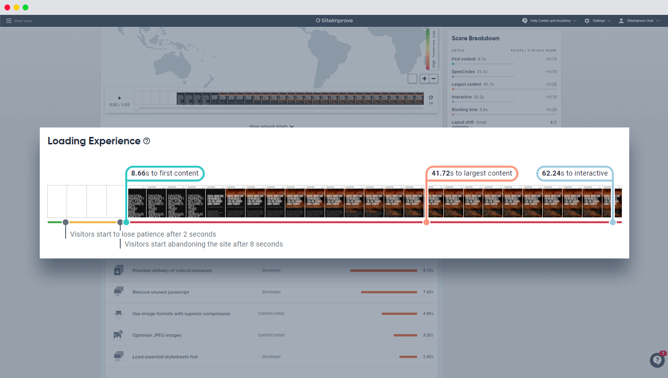 Siteimprove Performance hilft Ihnen dabei, die Ladezeiten Ihrer Website durch nutzerzentrierte Prüfungen, leicht verständliche Visualisierungen und einfache Erklärungen zu optimieren, damit Sie ein ideales Nutzererlebnis erzielen können.