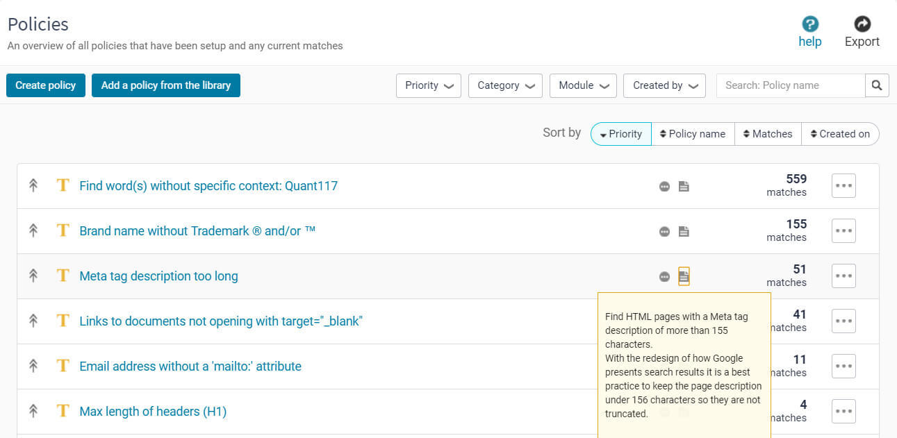 Kombinieren Sie Richtlinien von Qualitätssicherung- und SEO-Metriken, wie zum Beispiel eine Richtlinie, die Seiten mit zu langen Meta-Tags und einer niedrigen Klickrate in Google erkennt. Daraufhin können Sie die Meta-Tags abändern, neue Richtlinien festlegen und erneut überprüfen, ob sich die Klickrate verbessern konnte. Je mehr Module Sie haben, desto dynamischer werden Ihre Richtlinien.