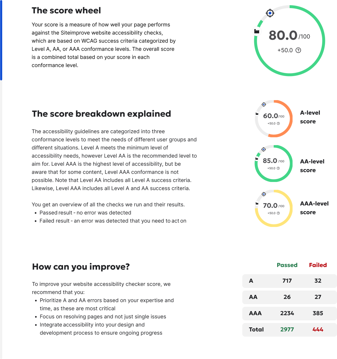 - Check your unique accessibility score. This score is based on the full accessibility checks of the Siteimprove accessibility tool and helps you get a clear idea of how accessible your website is.