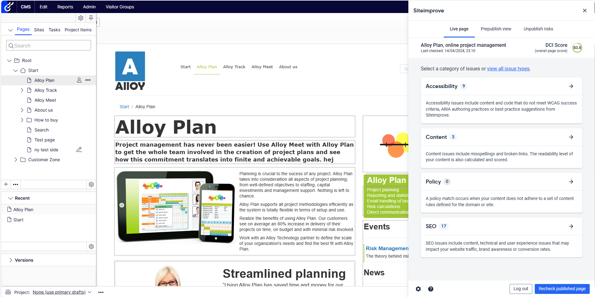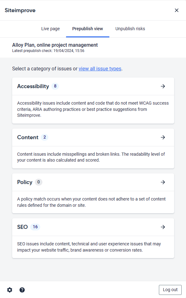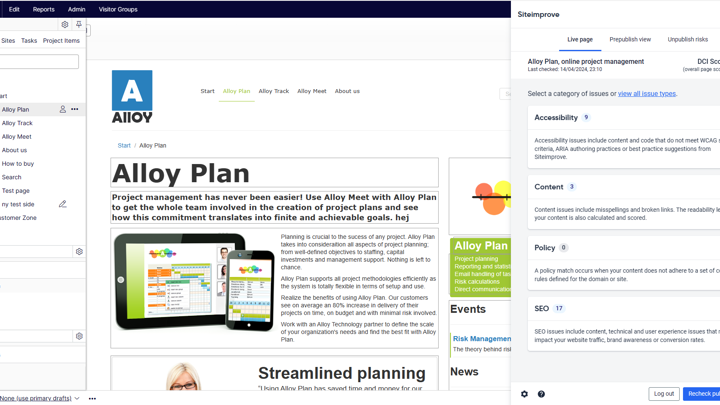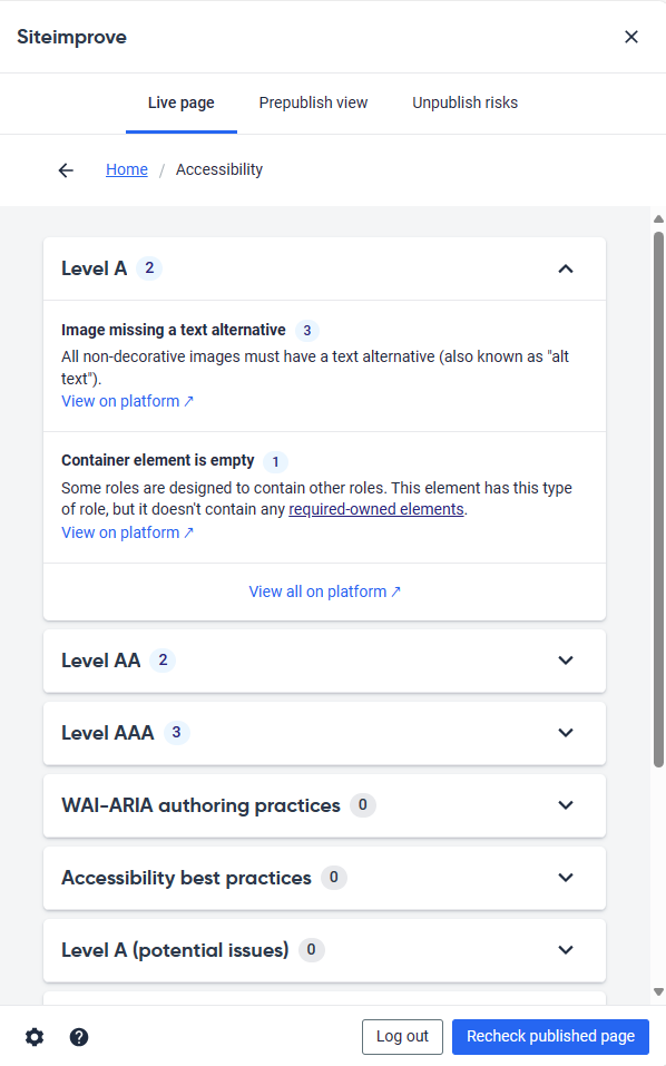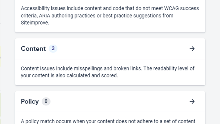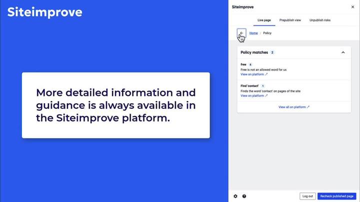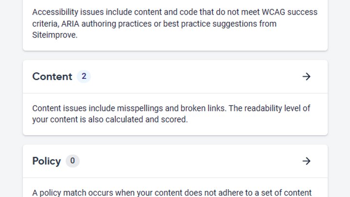 With the Siteimprove integration, you can see potential errors directly in Optimizely. Once errors are resolved, your content will be recrawled to see how the page has improved.