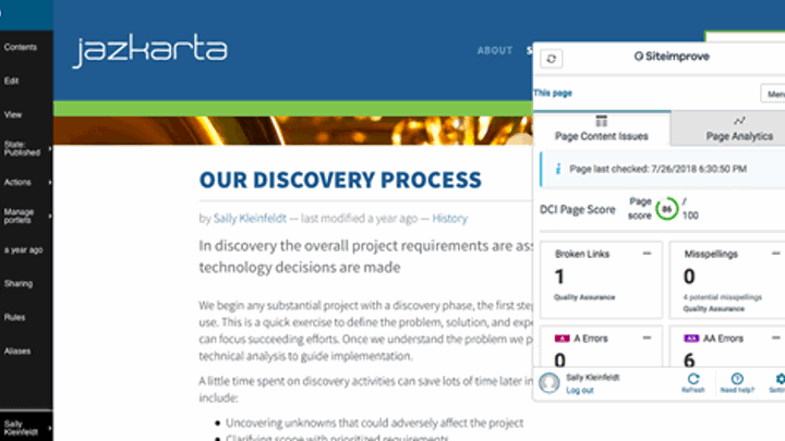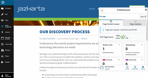 The integration between Siteimprove and Sitebox streamlines workflow efficiencies for your web team. With the Plugin, your team can fix errors and optimize content directly in the editing environment. Once a page is published, any changes you make are re-checked instantly–reducing the time your team spends on manual tasks.