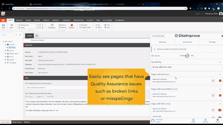 The seamless integration between Siteimprove and Sitecore streamlines workflow efficiencies for your web team. With the connector, your team can fix errors and optimize content directly within the editing environment. Once the detected issues have been assessed, you can re-check the relevant page in real-time and determine if further actions are needed.
