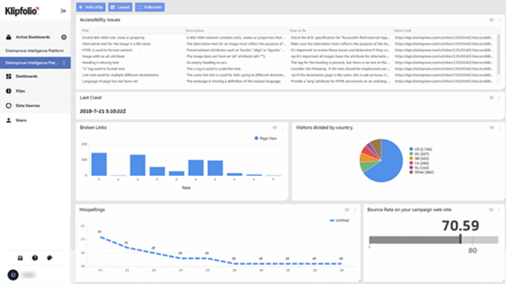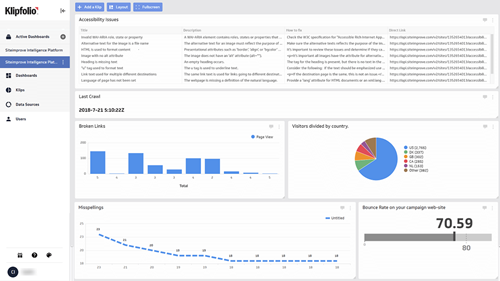 Klipfolio is a software company empowering over 10,000 customers to build their own dashboards and reports. The Klipfolio-Siteimprove Connector allows you to see your website's data in combination with other business metrics so you get the insights you need to continually improve and optimize your website.