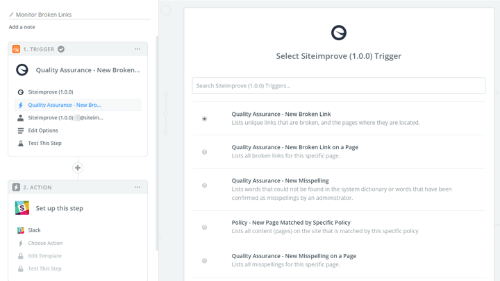 Would you like to receive a Slack or email notification when Siteimprove detects a broken link on your homepage? Or create a task in Trello or a Zendesk ticket for each new misspelling found? These are a few examples of what you can do with the Zapier Connector, but the possibilities are endless.